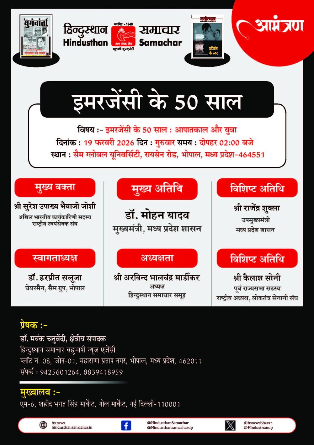 कार्यक्रम दोपहर 2 बजे सैम ग्लोबल यूनिवर्सिटी, रायसेन रोड परिसर, भोपाल में आयोजित होगा। आयोजन का उद्देश्य आपातकाल के ऐतिहासिक संदर्भ, उसके सामाजिक-राजनीतिक प्रभाव और युवा पीढ़ी के लिए उससे मिलने वाले संदेशों पर गंभीर चर्चा करना है।