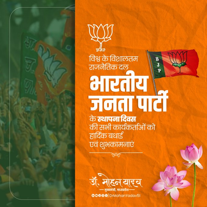मुख्यमंत्री डाॅ. यादव ने साेशल मीडिया एक्स पर अपने शुभकामना संदेश में लिखा- विश्व के विशालतम राजनैतिक दल भारतीय जनता पार्टी के स्थापना दिवस की सभी कार्यकर्ताओं को हार्दिक बधाई एवं शुभकामनाएं। आज आदरणीय प्रधानमंत्री श्री @narendramodi जी के मार्गदर्शन एवं राष्ट्रीय अध्यक्ष श्री @JPNadda जी के नेतृत्व में भाजपा गरीब कल्याण, सामाजिक न्याय, सांस्कृतिक गौरव और आत्मनिर्भर भारत के संकल्प के साथ देश को विकसित बनाने में महत्वपूर्ण भूमिका निभा रही है। आइए, स्थापना दिवस पर हम सभी कार्यकर्ता राष्ट्र प्रथम के मूलमंत्र को आत्मसात कर सेवा, सुशासन और समर्पण की भावना के साथ अपने कर्तव्यों का निर्वहन करते हुए माँ भारती के गौरव की पुनर्स्थापना के लिए आगे बढ़ते रहें।