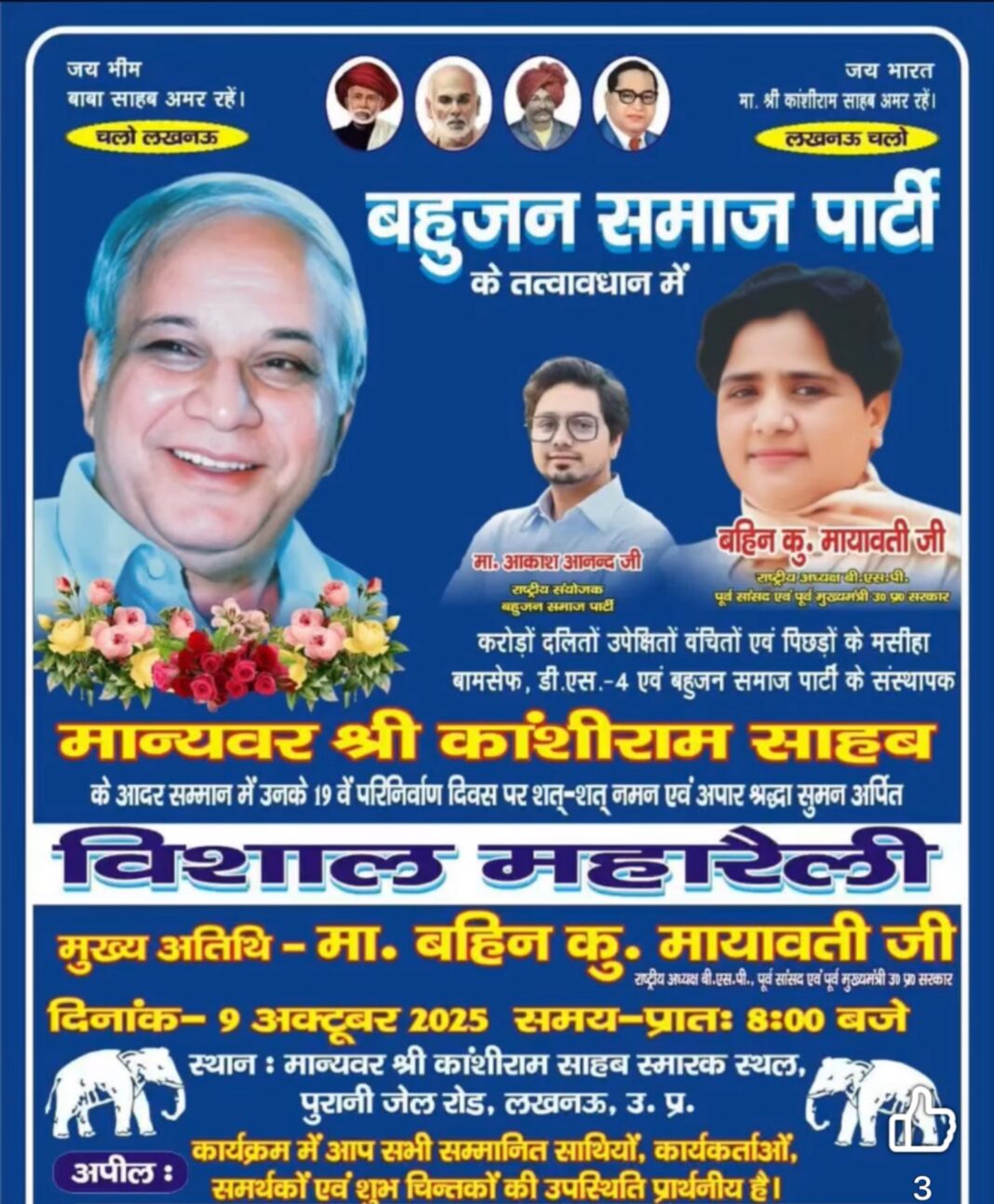 आगरा, 25 सितंबर (हि.स.)। आगामी 9 अक्टूबर को लखनऊ में काशीराम जी की पुण्यतिथि पर बसपा द्वारा विशाल रैली का आयोजन प्रस्तावित है। इस अवसर पर आगरा के सभी नौ विधानसभा क्षेत्रों से हजारों कार्यकर्ता लखनऊ पहुंचेंगे। पार्टी ने सभी जोनल, मंडल, सेक्टर, बूथ प्रभारी और जिला अध्यक्षों को निर्देशित किया है कि वे अधिक से अधिक संख्या में कार्यकर्ताओं को इस कार्यक्रम में शामिल करें।