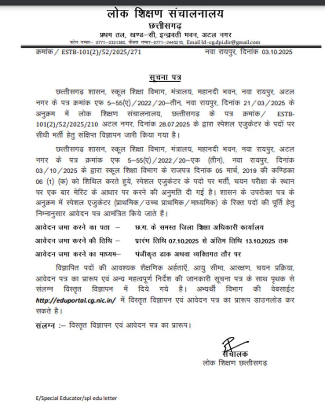 छत्तीसगढ़ सरकार ने बेरोजगार युवाओं के लिए छत्तीसगढ़ स्पेशल एजुकेटर भर्ती का नोटिफिकेशन जारी किया है। यह भर्ती प्राथमिक, उच्च प्राथमिक और माध्यमिक स्तर के रिक्त पदों के लिए होगी।