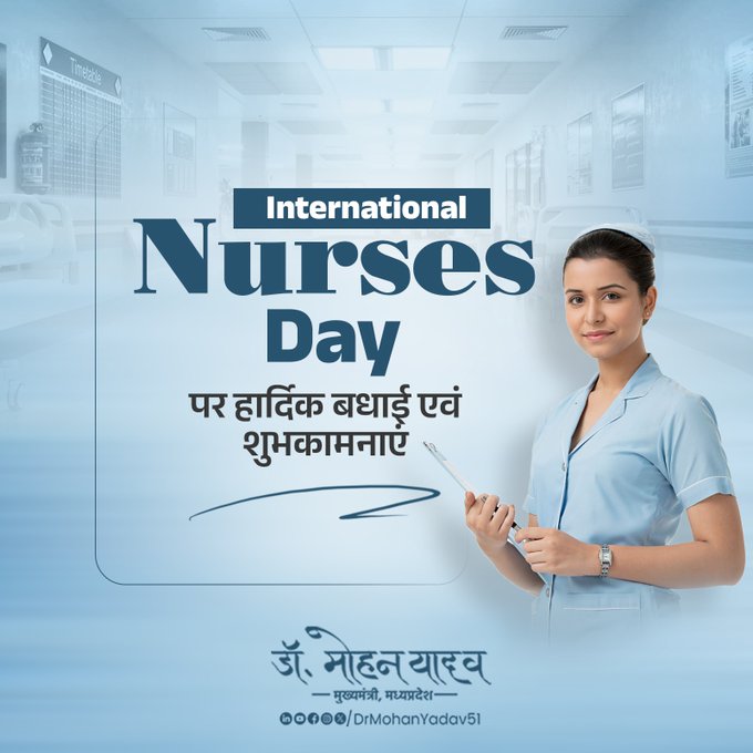 मुख्यमंत्री डाॅ यादव ने साेशल मीडिया एक्स पर अपने शुभकामना संदेश में लिखा International Nurses Day की हार्दिक बधाई एवं शुभकामनाएं।आधुनिक नर्सिंग की संस्थापक फ्लोरेंस नाइटिंगेल के अद्भुत समर्पण से प्रेरित यह कार्य साक्षात ईश्वर की सेवा है। पीड़ितों की सेवा के लिए आप सभी नर्स की आत्मीयता सदैव वंदनीय है।
