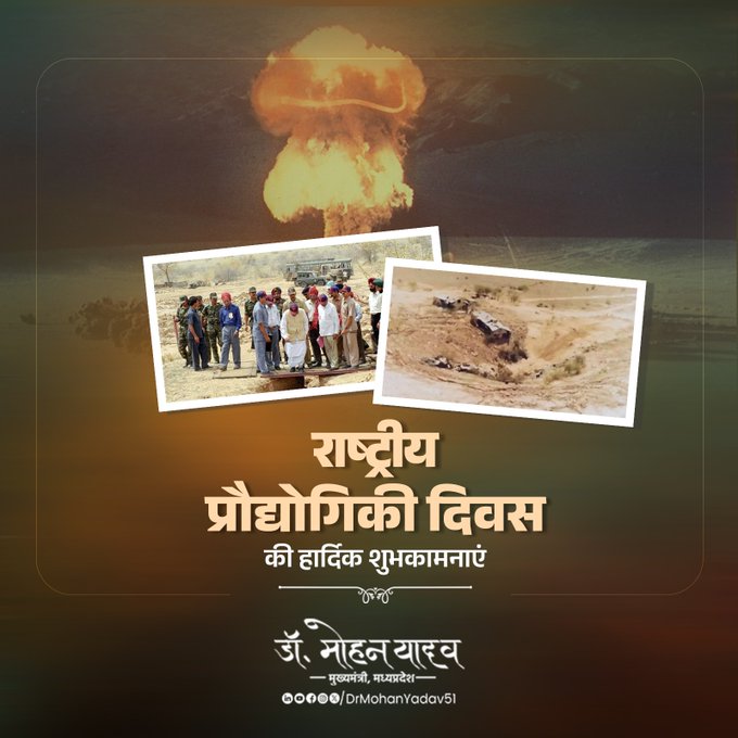 मुख्यमंत्री डाॅ यादव ने साेशल मीडिया एक्स पर पाेस्ट करते हुए लिखा राष्ट्रीय प्रौद्योगिकी दिवस की हार्दिक बधाई एवं शुभकामनाएं। वर्ष 1998 में आज के ही दिन पोखरण-II का सफल परीक्षण किया गया था। इस गौरवशाली अवसर पर देश के वैज्ञानिकों, इंजीनियरों की वैज्ञानिक और तकनीकी उपलब्धियों का स्मरण करते हुए उन विभूतियों को बारंबार प्रणाम, जिनके संकल्प व समर्पण से हमारा राष्ट्र प्रौद्योगिकी के विभिन्न आयामों में नित नए अध्याय जोड़ रहा है।