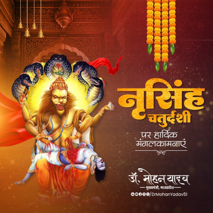 मुख्यमंत्री डाॅ यादव ने साेशल मीडिया एक्स पर अपने शुभकामना संदेश में लिखा ॐ उग्रं वीरं महाविष्णुं ज्वलन्तं सर्वतोमुखम्। नृसिंहं भीषणं भद्रं मृत्यु मृत्युं नमाम्यहम्॥ भगवान विष्णु के चौथे अवतार भगवान नृसिंह जी के प्राकट्य दिवस नृसिंह चतुर्दशी की हार्दिक मंगलकामनाएं। भगवान नृसिंह की अपार कृपा से सभी के जीवन में सुख एवं समृद्धि का वास हो; यही करबद्ध प्रार्थना करता हूँ।