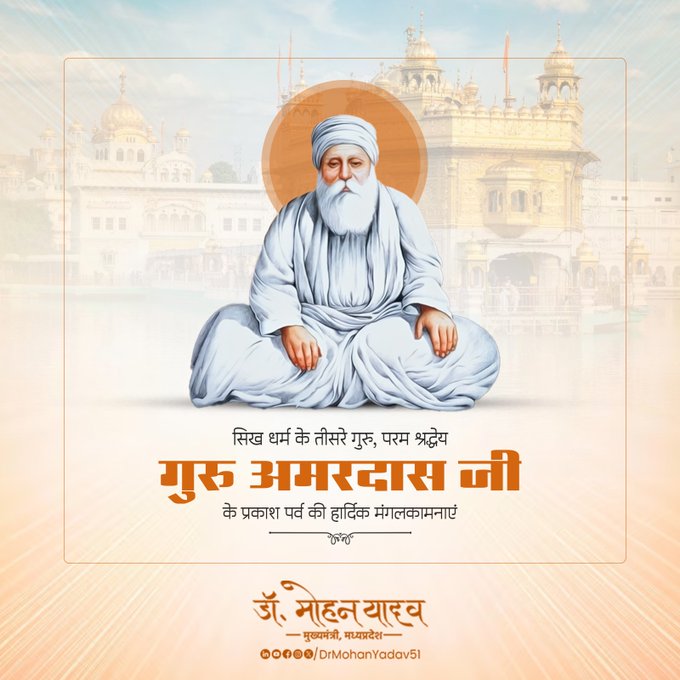 मुख्यमंत्री डाॅ यादव ने साेशल मीडिया एक्स पर पाेस्ट करते हुए लिखा सिख धर्म के तीसरे गुरु, परम श्रद्धेय गुरु अमरदास जी के प्रकाश पर्व की हार्दिक बधाई एवं शुभकामनाएं। सामंतवाद, जाति-प्रथा, ऊंच-नीच, सती प्रथा जैसी सामाजिक बुराइयों से मुक्ति का मार्ग दिखाकर आपने लोक कल्याण का अद्भुत संदेश दिया। आपके चरणों में शत्-शत् प्रणाम करता हूं।