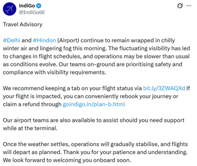 इंडिगो ने सोशल मीडिया प्लेटफॉर्म एक्स पर जारी ट्रैवल एडवाइजरी में कहा कि