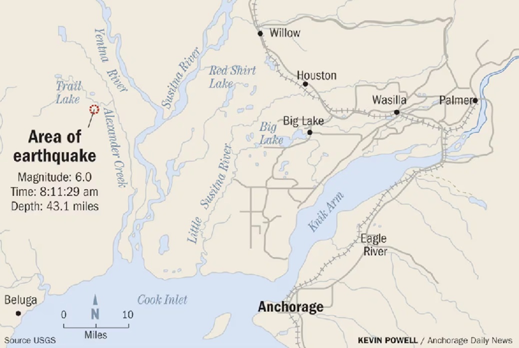 अलास्का के एंकोरेज महानगरीय क्षेत्र में 6.0 तीव्रता का भूकंप