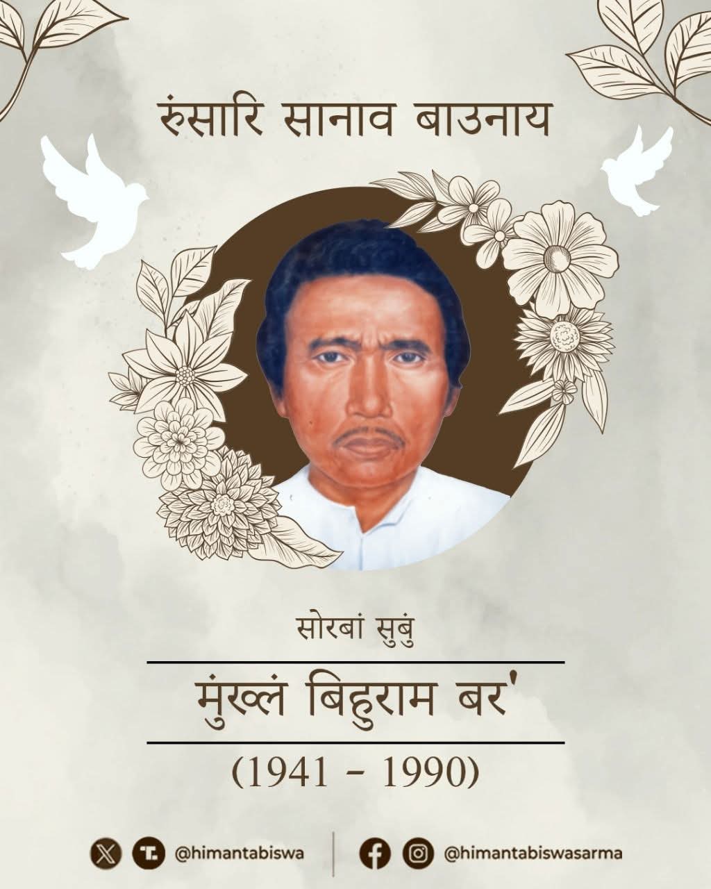 गुवाहाटी, 27 सितंबर। असम के मुख्यमंत्री डॉ. हिमंत बिस्व सरमा ने प्रख्यात साहित्यकार और शिक्षाविद बिहुराम बोडो की पुण्यतिथि पर उन्हें भावभीनी श्रद्धांजलि अर्पित की।