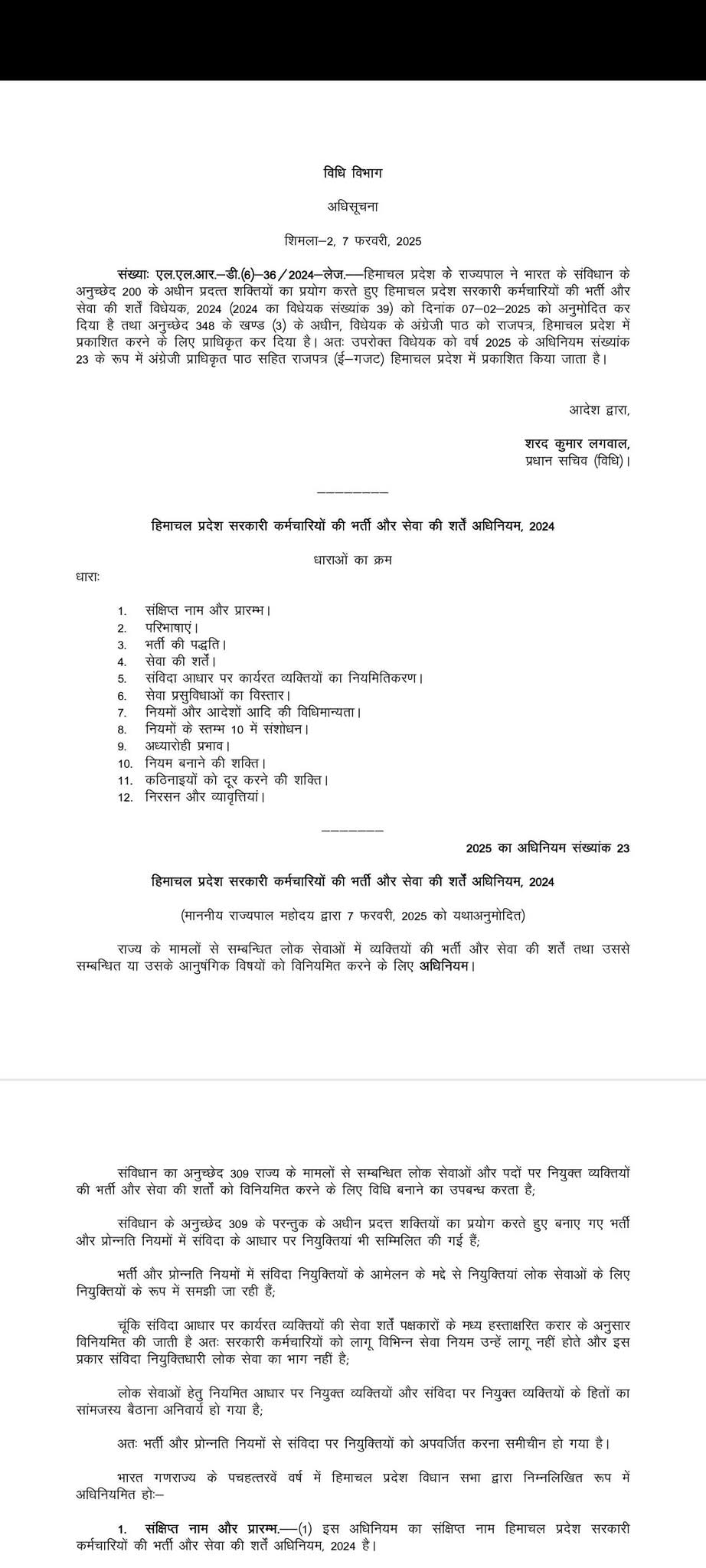 शिमला, 08 फ़रवरी (हि.स.)। हिमाचल प्रदेश में सरकारी अनुबंध कर्मचारियों को अब नियमित होने के बाद ज्वाइनिंग तिथि से वरिष्ठता और वित्तीय लाभ नहीं मिलेगा। राज्यपाल शिव प्रताप शुक्ल ने हिमाचल प्रदेश सरकारी कर्मचारी भर्ती एवं सेवा की शर्तें विधेयक 2024 को अपनी मंजूरी दे दी है। जिसके बाद यह विधेयक अब राजपत्र में प्रकाशित कर दिया गया है। प्रधान सचिव विधि की ओर से इस सम्बंध में अधिसूचना जारी हुई है। इस विधेयक के लागू होने से करीब 80 हजार अनुबंध कर्मचारियों पर प्रभाव पड़ेगा जो अब अपनी अनुबंध अवधि को नियमित सेवाकाल में जोड़ने का लाभ नहीं ले पाएंगे।