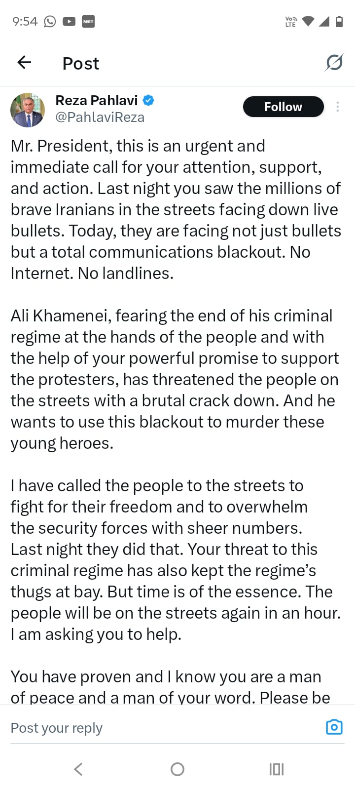निर्वासित नेता रजा पहलवी ने अमेरिका से समर्थन मांगा है।
