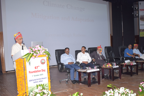 केंद्रीय शुष्क क्षेत्र अनुसंधान संस्थान (काजरी) जोधपुर ने मंगलवार को अपना 67वां स्थापना दिवस धूमधाम से मनाया। इस अवसर पर मुख्य अतिथि भारतीय मौसम विभाग के पूर्व महानिदेशक डॉ. लक्ष्मण सिंह राठौड़ ने कहा कि वैज्ञानिकों के शोध और तकनीकी नवाचारों से थार मरुस्थल में कृषि उत्पादन में उल्लेखनीय बढ़ोतरी हुई है।