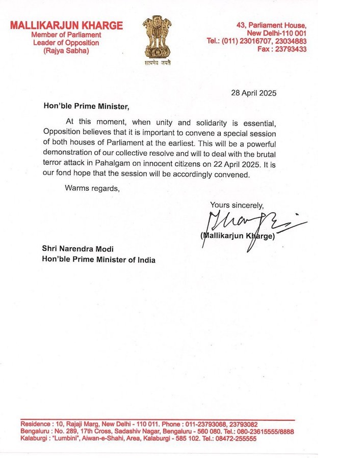 कांग्रेस अध्यक्ष और राज्यसभा में विपक्ष के नेता मल्लिकार्जुन खरगे ने 28 अप्रैल को लिखे पत्र में प्रधानमंत्री मोदी से अनुरोध किया है कि 22 अप्रैल को पहलगाम में हुए क्रूर आतंकवादी हमले से उत्पन्न स्थिति से निपटने के लिए सामूहिक इच्छाशक्ति का प्रदर्शन जरूरी है। इसलिए संसद के दोनों सदनों का विशेष सत्र यथाशीघ्र बुलाया जाए।