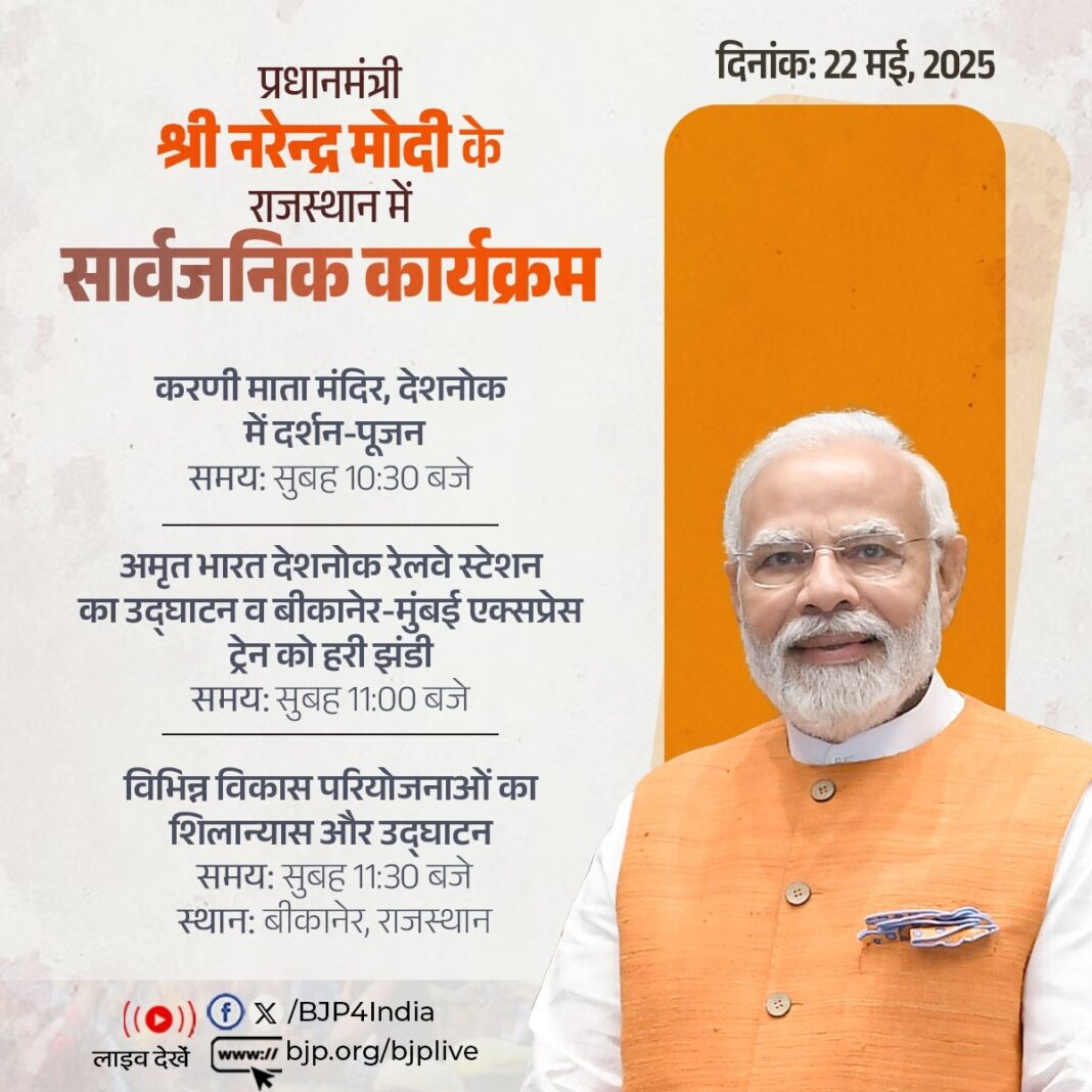 विज्ञप्ति के अनुसार, प्रधानमंत्री नरेन्द्र मोदी सुबह लगभग 11:30 बजे अमृत भारत स्टेशन योजना के तहत पुनर्विकसित देशनोक स्टेशन का उद्घाटन करेंगे और बीकानेर-मुंबई एक्सप्रेस ट्रेन को हरी झंडी दिखाएंगे। इसके बाद प्रधानमंत्री 26,000 करोड़ रुपये से अधिक की लागत वाली कई विकास परियोजनाओं का शिलान्यास और उद्घाटन करेंगे। वो पलाना में सार्वजनिक समारोह को भी संबोधित करेंगे।