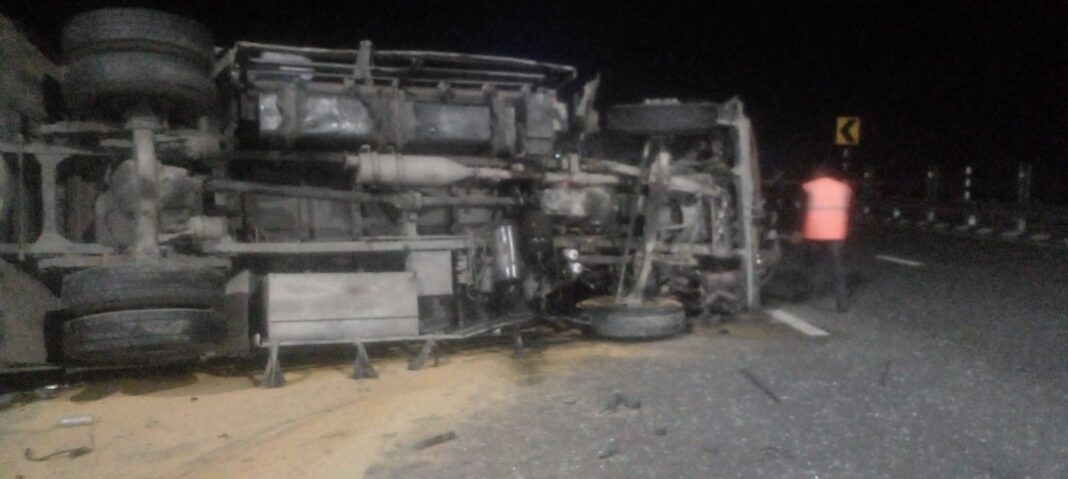 Purvanchal Expressway Accident के बाद ट्रक मौके पर ही पलट गया।
