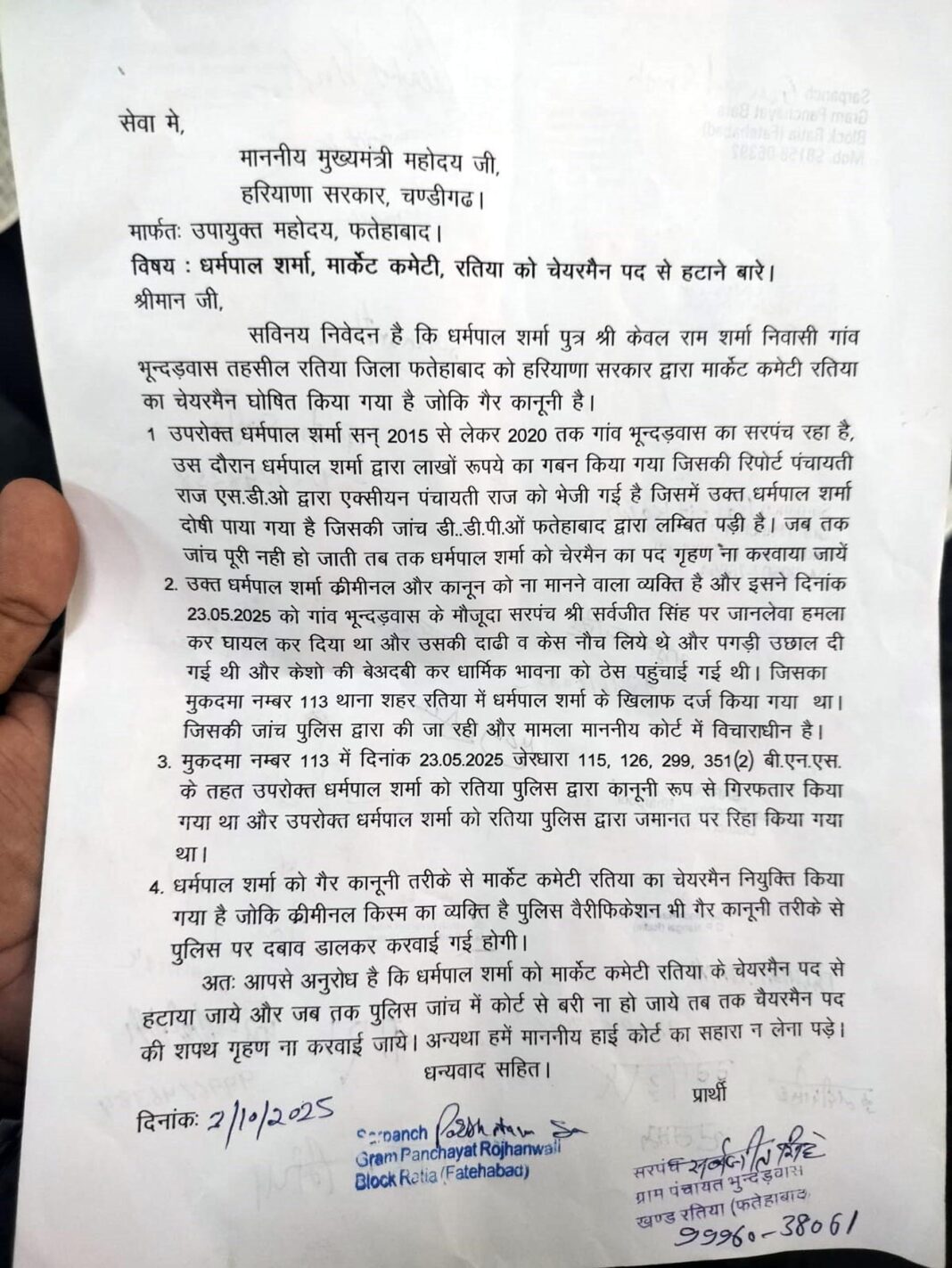 ज्ञापन में यह भी उल्लेख किया गया कि धर्मपाल शर्मा और गांव के सरपंच के बीच कुछ महीने पहले विवाद हुआ था, जो मारपीट तक पहुंच गया था। इसे देखते हुए उनके पद पर बने रहना अनुचित बताया गया।