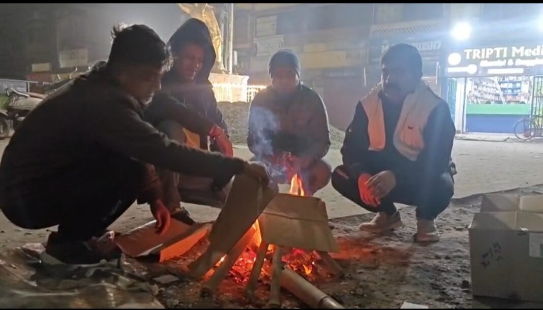 राहगीर और मजदूर जगह-जगह आग जलाकर खुद को गर्म रखने की कोशिश कर रहे हैं।