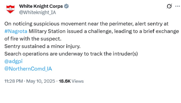 व्हाइट नाइट कोर ने सोशल मीडिया प्लेटफॉर्म ‘एक्स’ पर जानकारी दी, “परिधि के पास संदिग्ध गतिविधि दिखने पर सतर्क संतरी ने चुनौती दी, जिसके बाद गोलीबारी हुई। इस दौरान संतरी को मामूली चोट आई है। तलाशी अभियान चल रहा है।”