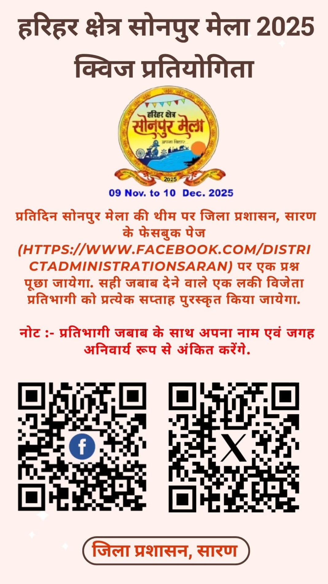 जिला प्रशासन ने बताया कि सही जवाब देने वालों में से हर सप्ताह कुछ Lucky Winners को चुना जाएगा। इससे भागीदारी और अधिक रोमांचक बन गई है। यह सोनपुर मेला क्विज 10 दिसंबर 2025 तक लगातार चलेगा और यह आधुनिक समय में विरासत संरक्षण की बड़ी पहल मानी जा रही है।