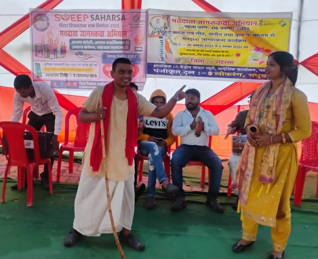 यह कार्यक्रम स्वीप कोषांग, सहरसा के दिशानिर्देश में आयोजित किया गया। कलाकारों ने अपने प्रदर्शन के जरिए उपस्थित नागरिकों को बताया कि लोकतंत्र में हर मतदाता की भागीदारी अत्यंत आवश्यक है। उन्होंने सभी से 6 नवंबर को होने वाले विधानसभा चुनाव में अपने-अपने मतदान केंद्र पर पहुंचकर मतदान करने की अपील की।